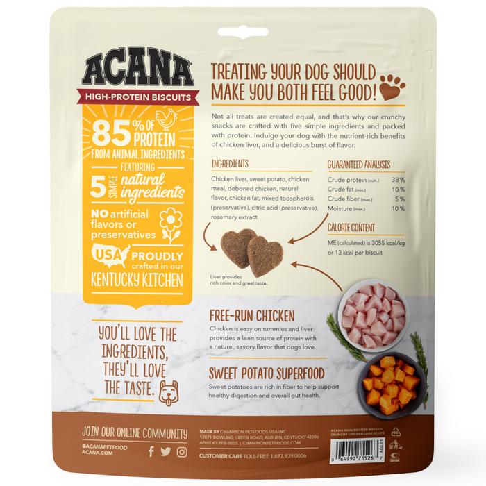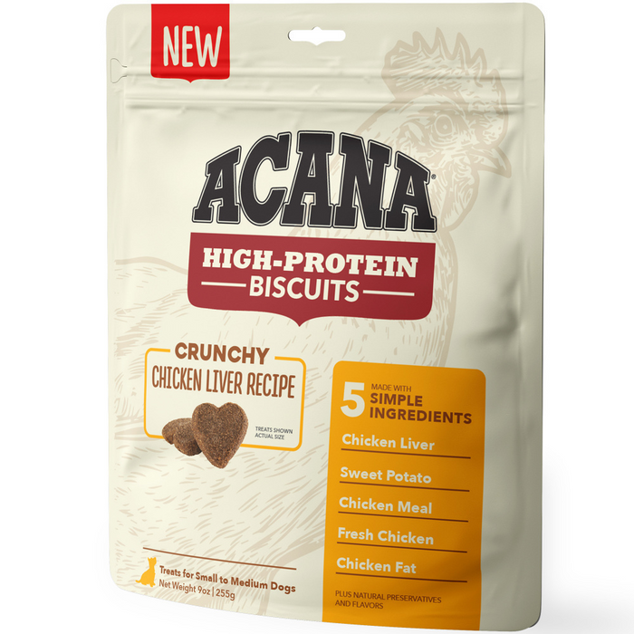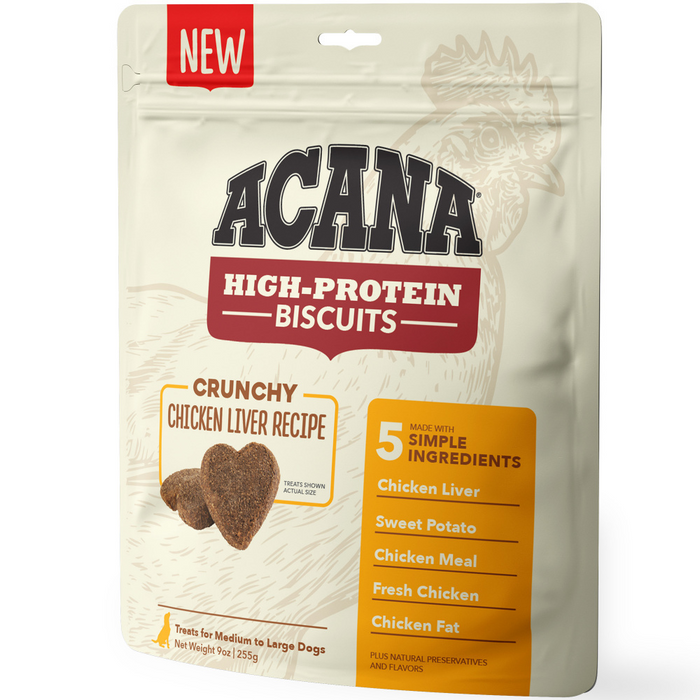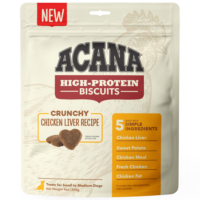 - One (1) 9 oz bag of ACANA High Protein Biscuits Crunchy Chicken Liver Recipe Dog Treats