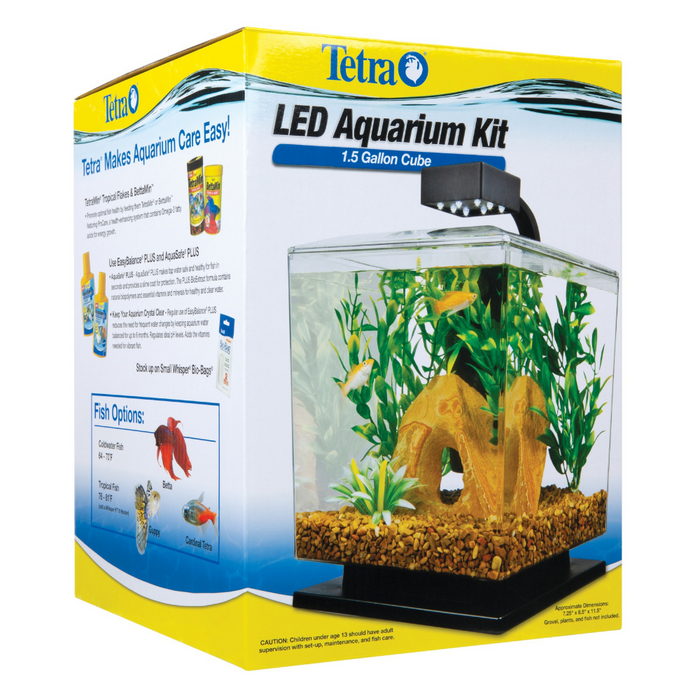• Includes a seamless aquarium, a clear cover, a unique black base, elevated, overhead LED lights, and a Tetra Whisper filtration unit