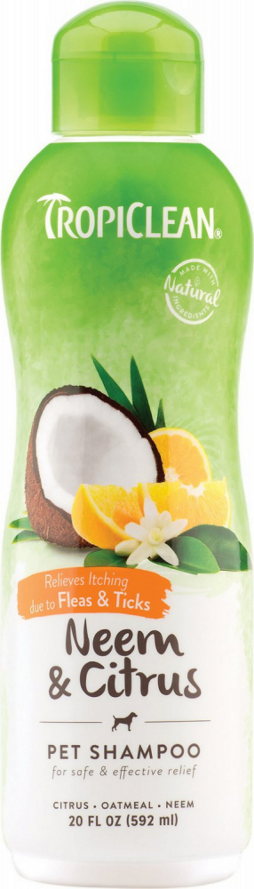 TropicleanNaturally soothes itchy skin TROPICLEAN NEEM & CITRUS DOG SHAMPOO for safe, effective relief from fleas and ticks FOR DOGS 12 WEEKS+ ONLY. T...