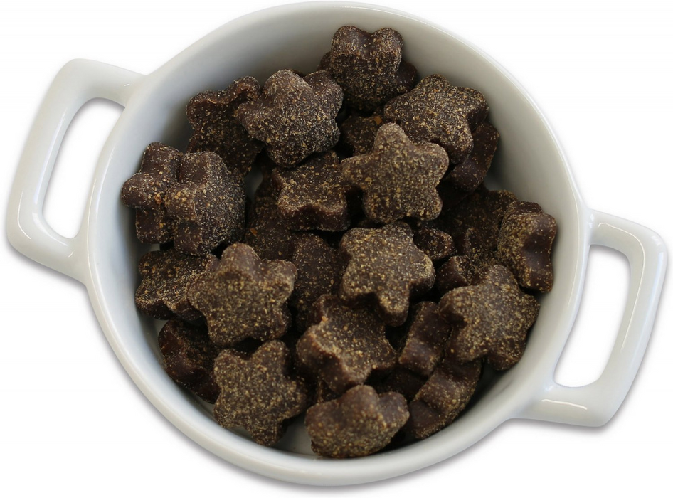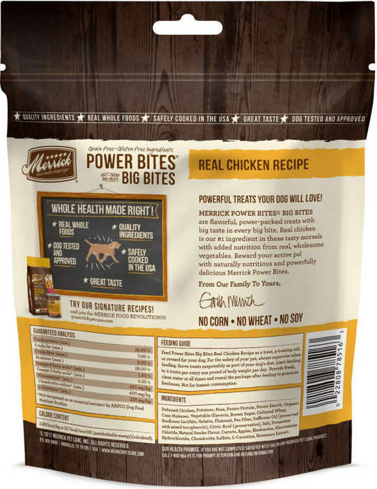 Merrick Power Bites are soft and chewy natural treats, with big taste and significant levels of powerful protein packed into every bite. Merrick is excited to now offer Big Bites for large breed dogs. Larger star-shaped treats are perfect for training and rewarding large-breed dogs. In addition to bigger bite sizes, Big Bites include glucosamine for hip and joint health, as well as Omega 3 and Omega 6 fatty acids that support healthy skin and coat. Big Bites are grain-free and gluten-free, without sorbic acid.