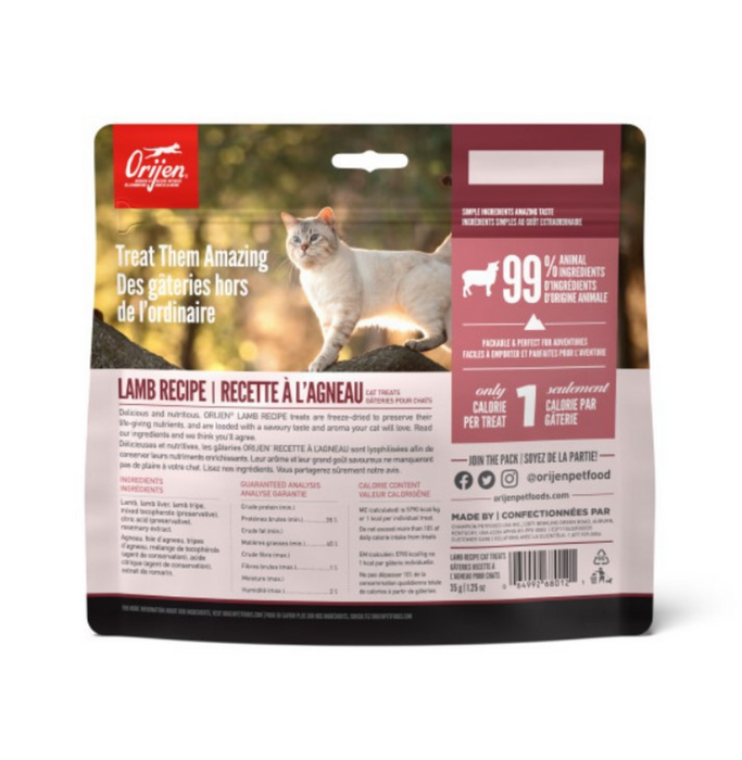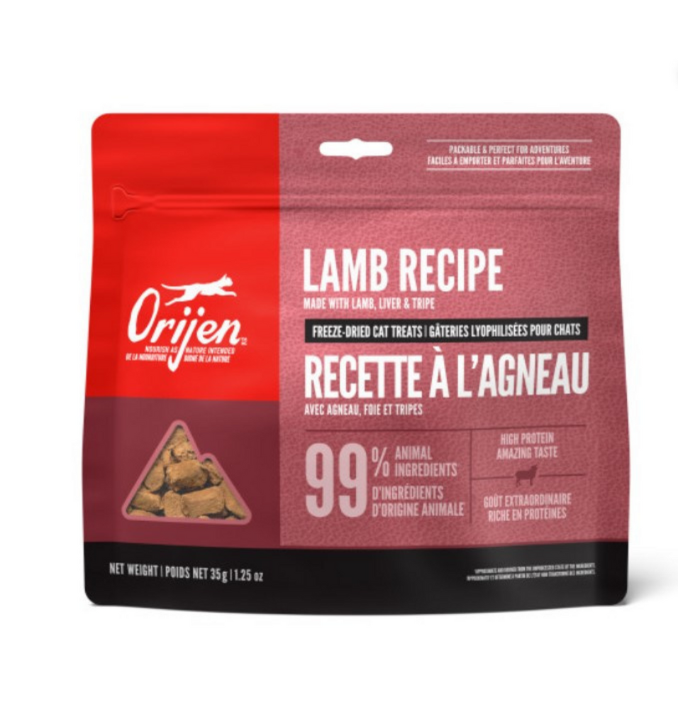 "Treat your cat to nutritious and delicious ORIJEN® Freeze-Dried Treats. Packed with animal protein, our Lamb Recipe is made with 99% animal ingredients* including nourishing lamb, liver and tripe. Freeze-dried to lock in their rich nutrients and flavor, they’re packable and perfect for adventures. At just one calorie each, ORIJEN Freeze-Dried Treats are loaded with protein and amazing taste.