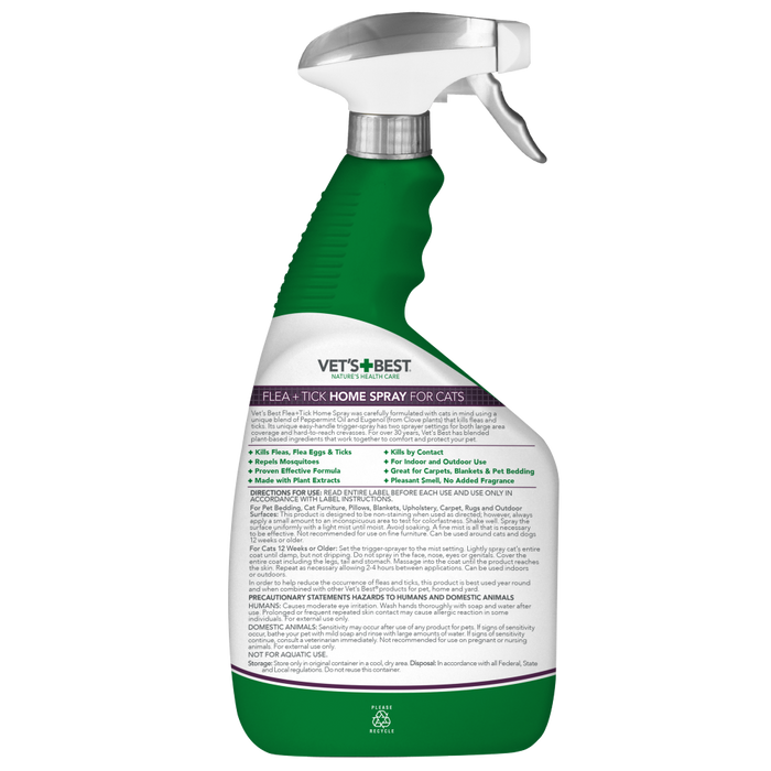 VET'S BEST FLEA AND TICK HOME SPRAY FOR CATS kills fleas, flea eggs, and ticks by contact. Our formula also repels mosquitos!