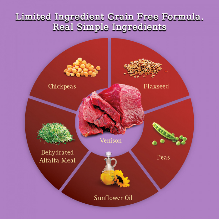 Venison, Venison Meal, Chickpeas, Peas, Chickpeas Flour, Sunflower Oil (Preserved with Citric Acid), Flaxseed, Dehydrated Alfalfa Meal, Natural Flavors, Salt, Choline Chloride, Vitamins (Vitamin A Acetate, Vitamin D3 Supplement, Vitamin E Supplement, Niacin, D-Calcium Pantothenate, Thiamine Mononitrate, Pyridoxine Hydrochloride, Riboflavin Supplement, Folic Acid, Biotin, Vitamin Bl2 Supplement), DL Methionine, Dicalcium Phosphate, Taurine, Minerals (Zinc Proteinate, Iron Proteinate, Copper Proteinate, Cobalt Proteinate, Manganese Proteinate, Calcium Iodate, Sodium Selenite), Mixed Tocopherols (Preservative), DHA, Potassium Chloride, L-Carnitine.Guaranteed Analysis